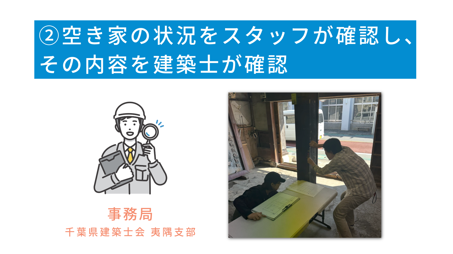 ②スタッフが現地確認→建築士が安全性・不動産の状態をチェックします。建物劣化がひどい場合は対象外となる可能性がありますが、その場合も