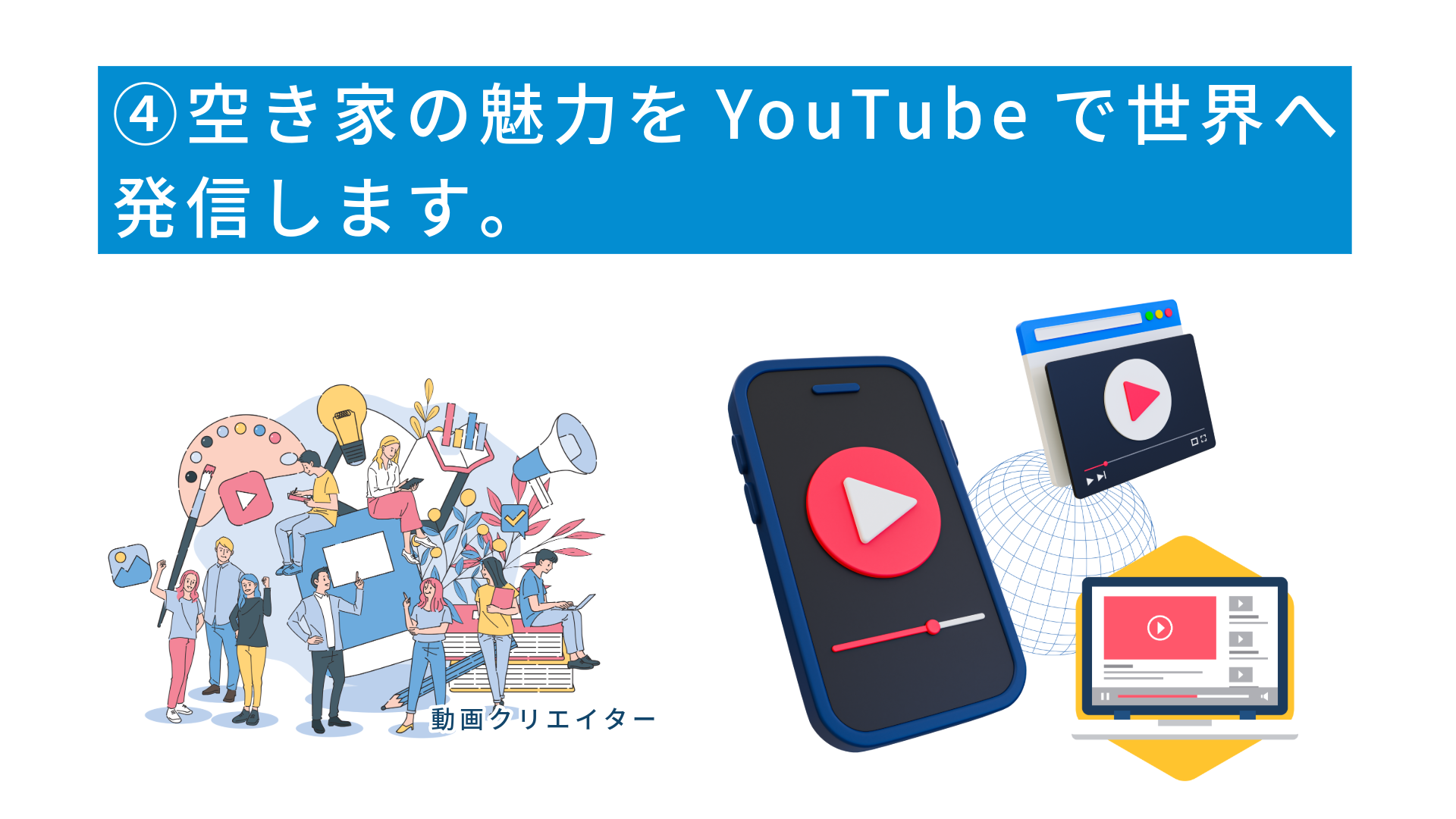 ④空き家の魅力をYouTubeで世界へ発信します。→この動画を視聴した購入希望者から問い合わせが事務局に入ります。