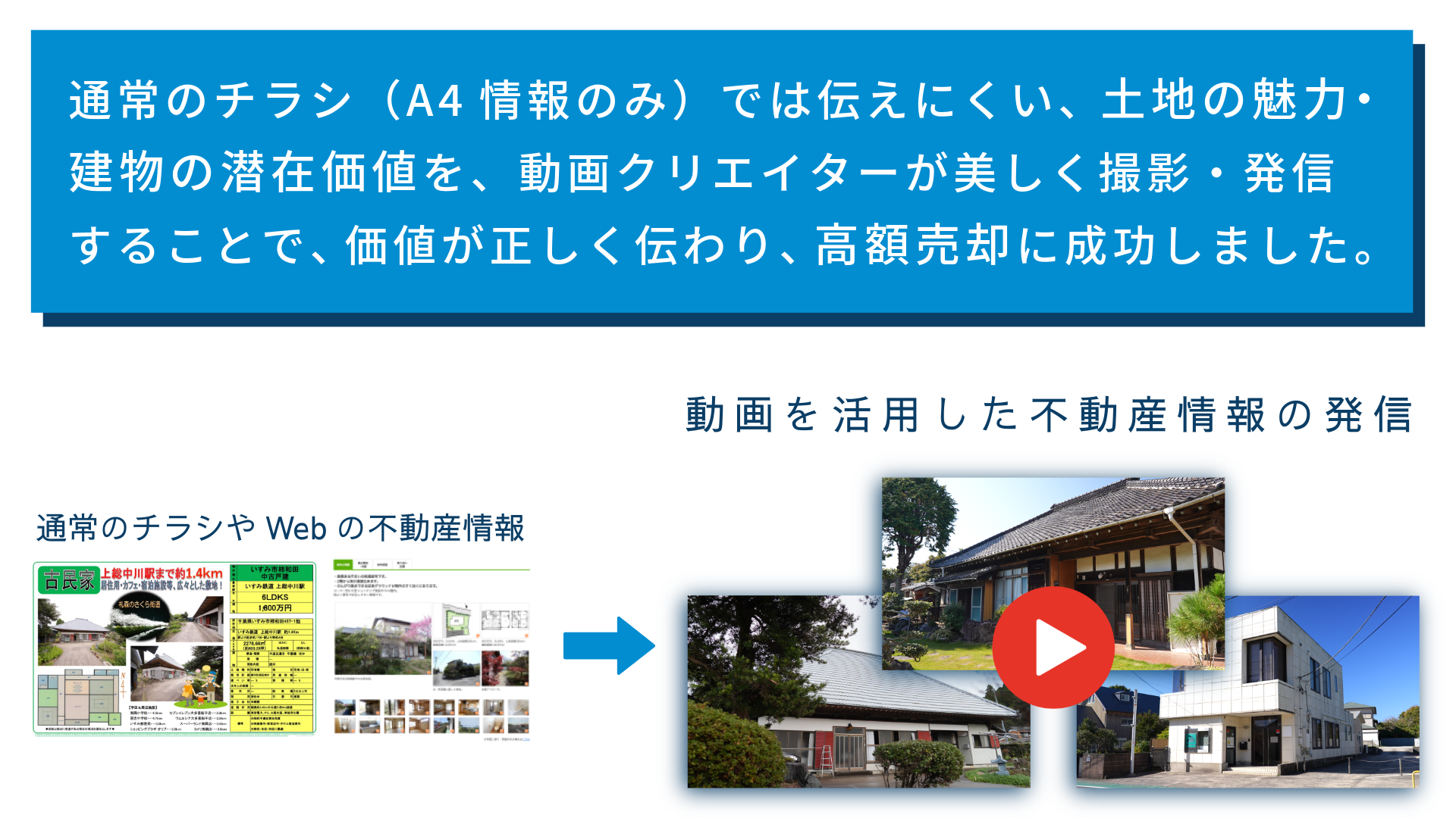 通常のチラシ(A4情報のみ)では伝えにくい、土地の魅力・建物の潜在価値を、動画クリエイターが美しく撮影・発信することで、価値が正しく伝わり、高額売却に成功しました。